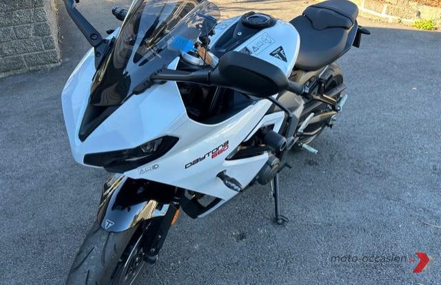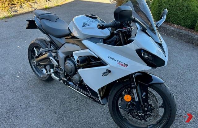 Triumph Daytona 660, Année 2024, Couleur Blanc, 3250 km, 48 CH, 660 cc, 201 kg, type sport, Ordinateur de bord, Tankpad, Coussins chauffants, Barres antiroulis, Pare-brise…